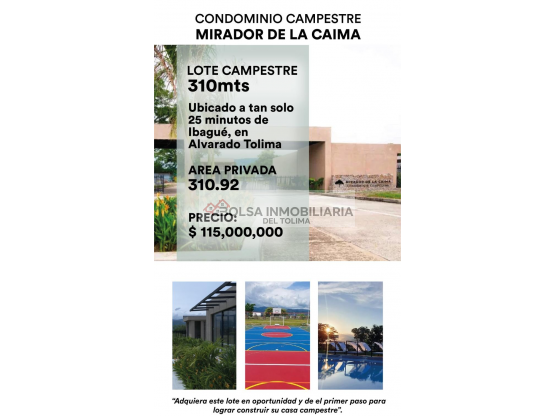 VENDO LOTE CAMPESTRE EN CONJUNTO CERRADO CONDOMINIO MIRADOR DE LA CAIMA EN ALVARADO TOLIMA